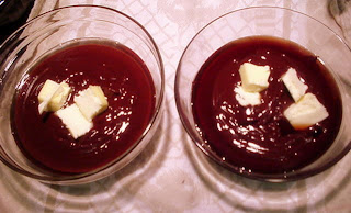 Divide the chocolate into two separate bowls. and add 1 tablespoon of chilled butter and Grand Marnier (2T) in one bowl, 1 T of chilled butter and Chambord(2T) to the other. Mix until fully incorporated.