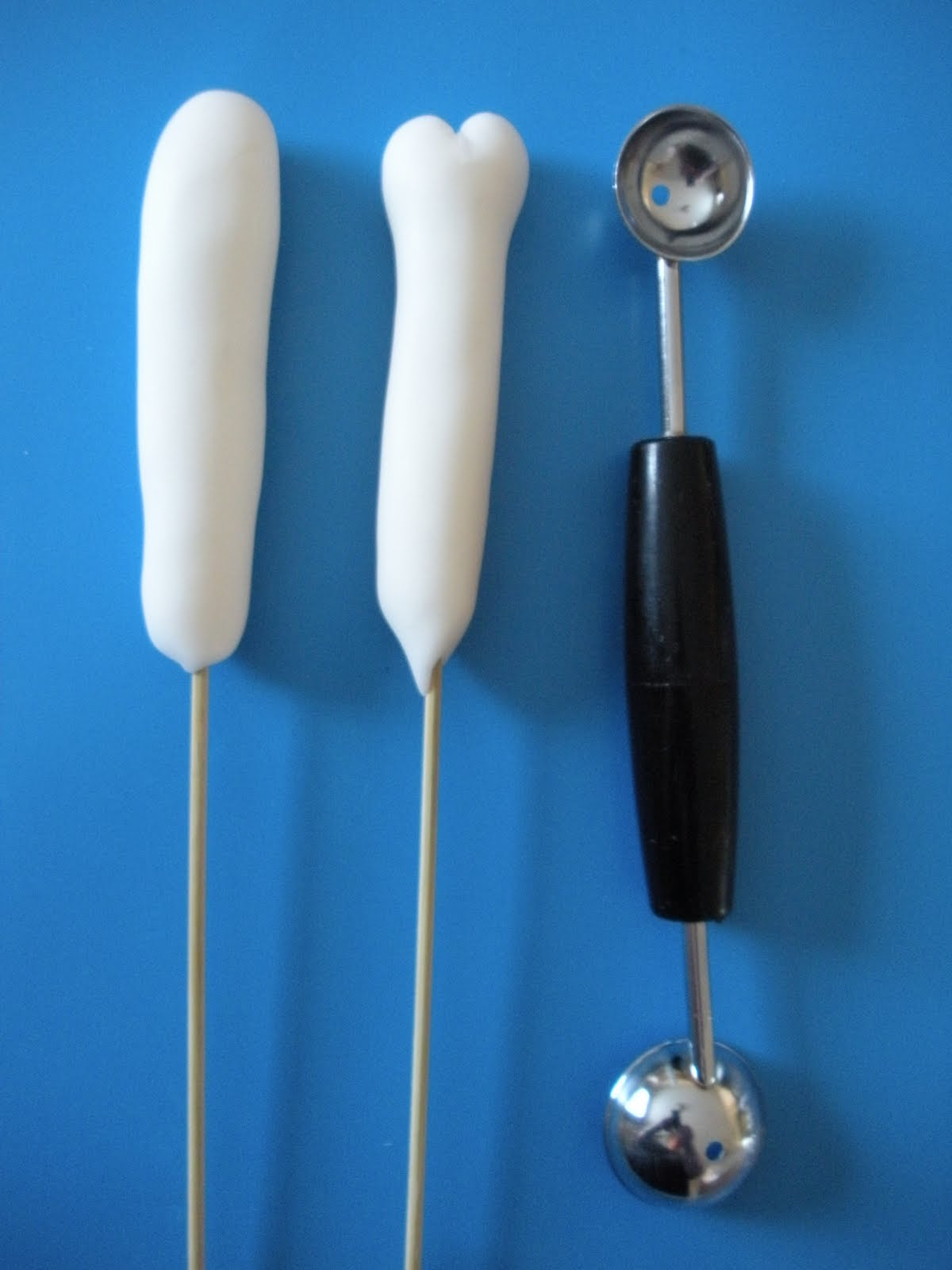 For the leg bones, I put some gumpaste on a skewer, rolling to the length I wanted. I used a melon baller to round out the end of the bone. Cut the skewer to desired length also.