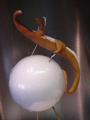 4.When body is dry, using golden brown gumpaste, cover the underbody of the dragon from the tail to the head. Cover the upper legs and all of the arms.