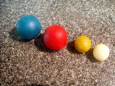 Roll out a red and blue ball the size of a large gumball