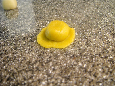 Divide the gold ball in half. Press one half with your finger to make a