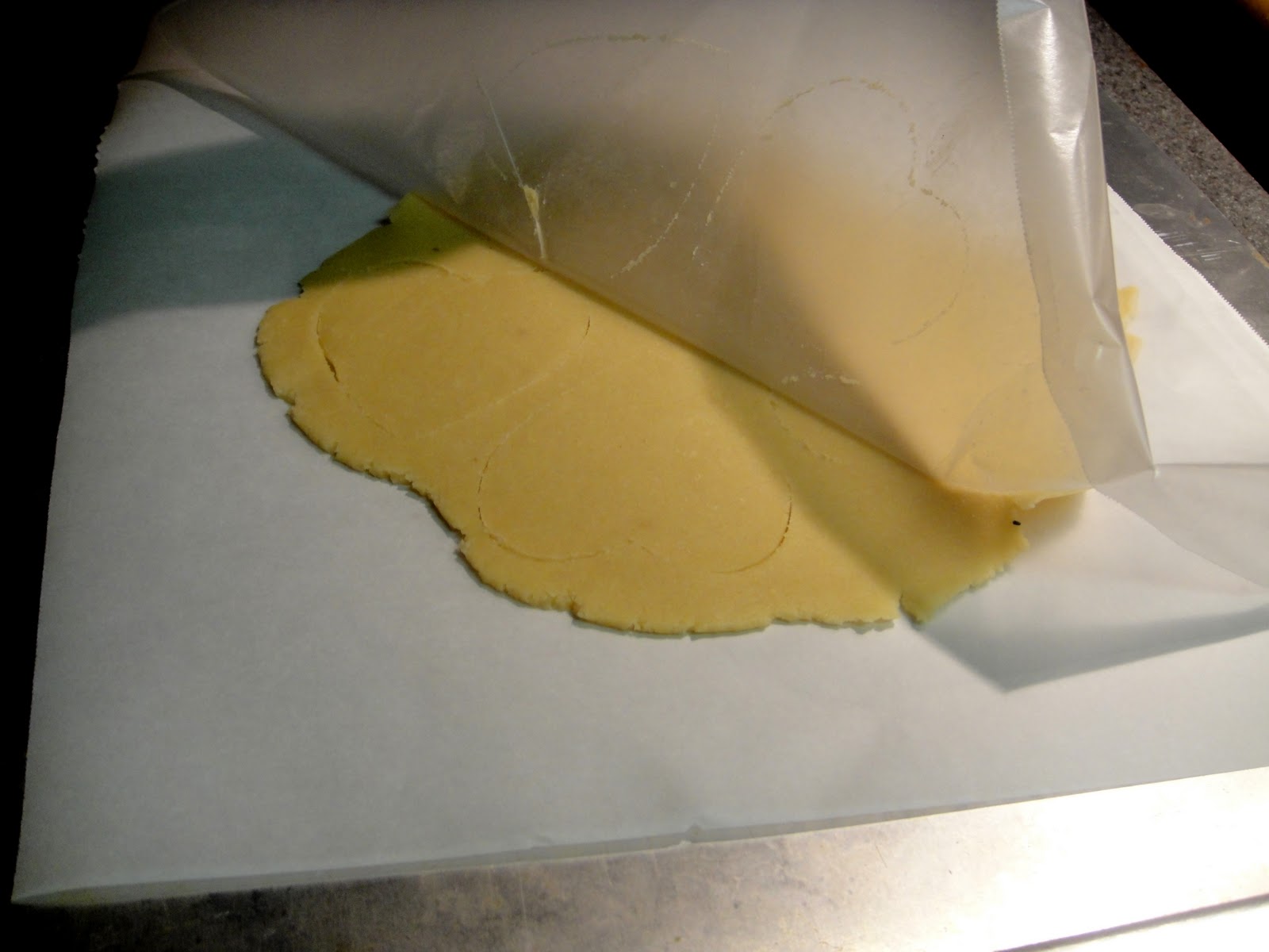 Flip over onto parchment paper and peel the wax paper from the dough.