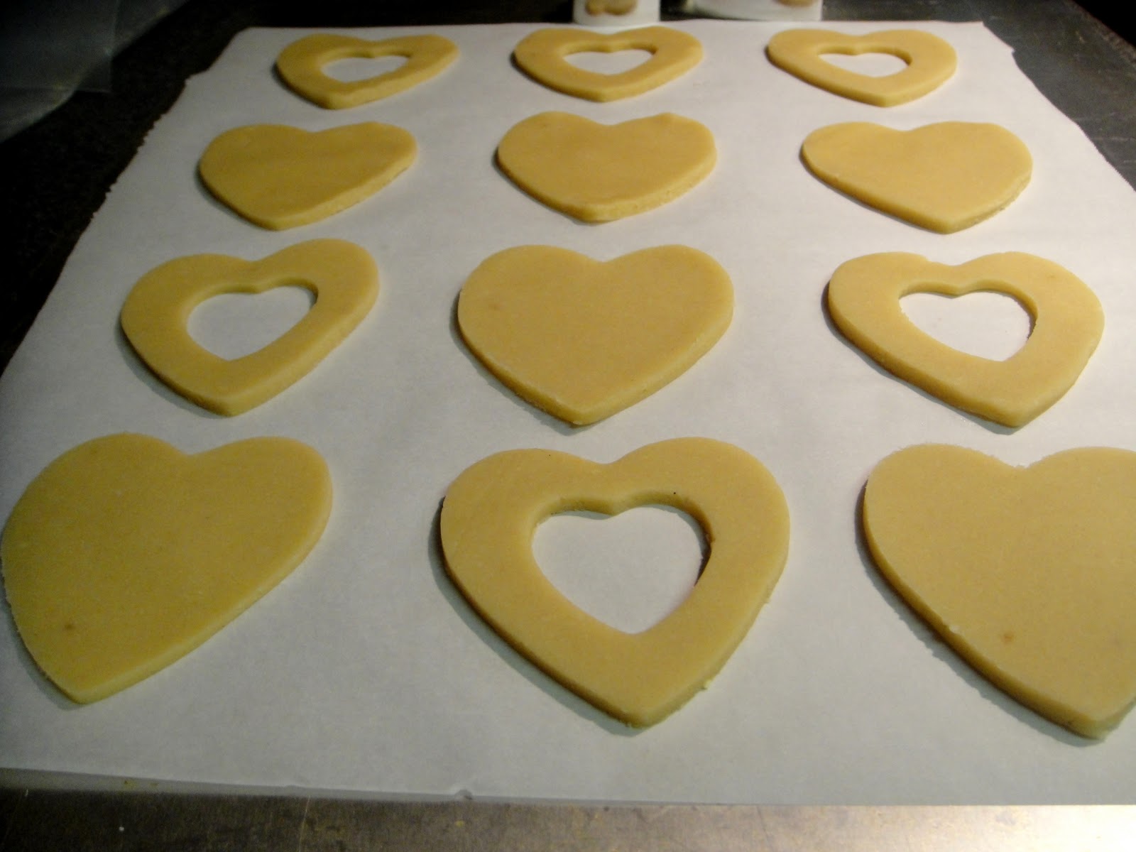 For every other heart, cut the center with a 1" heart shaped cutter, creating a "window" for the jam filling.