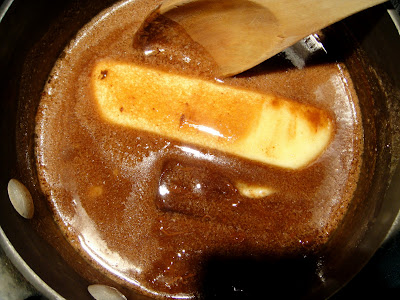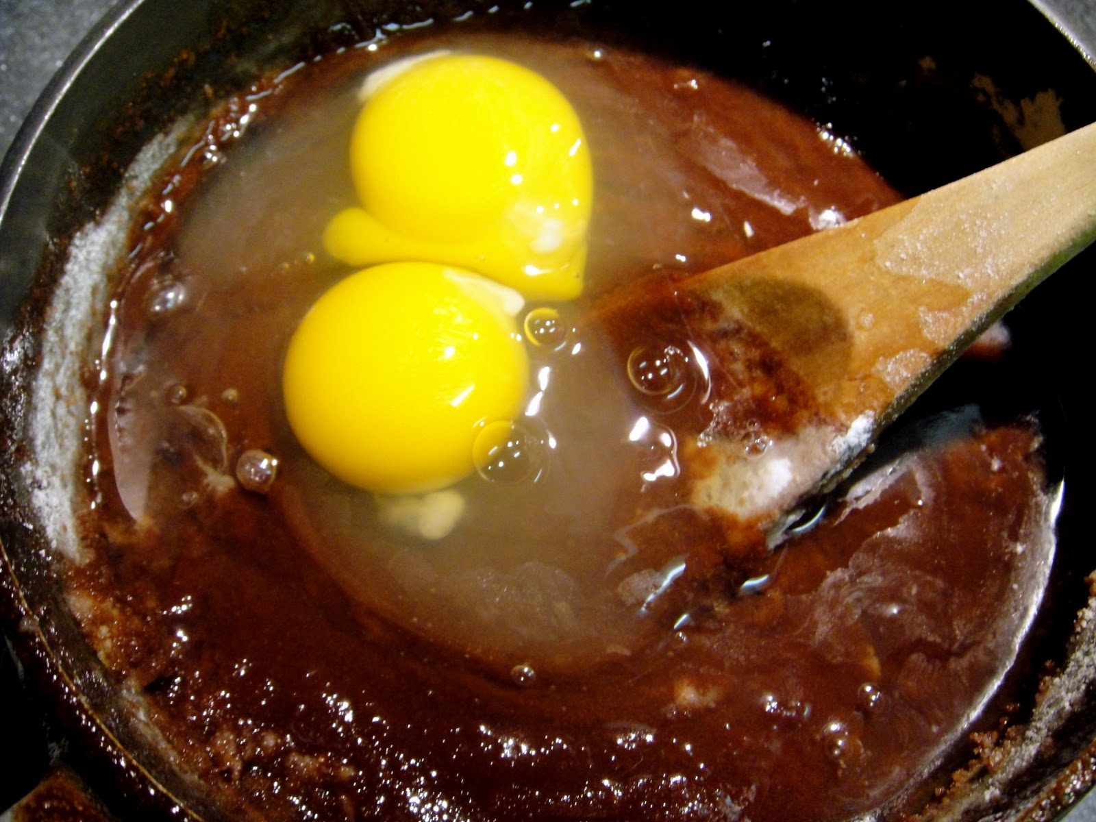 1. In a saucepan, melt together butter and unsweetened chocolate;
