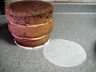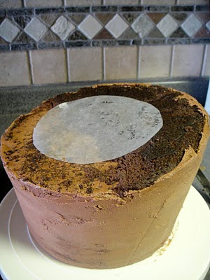 2. Attaching the cake circle with fresh frosting, I flipped the cake upright again...