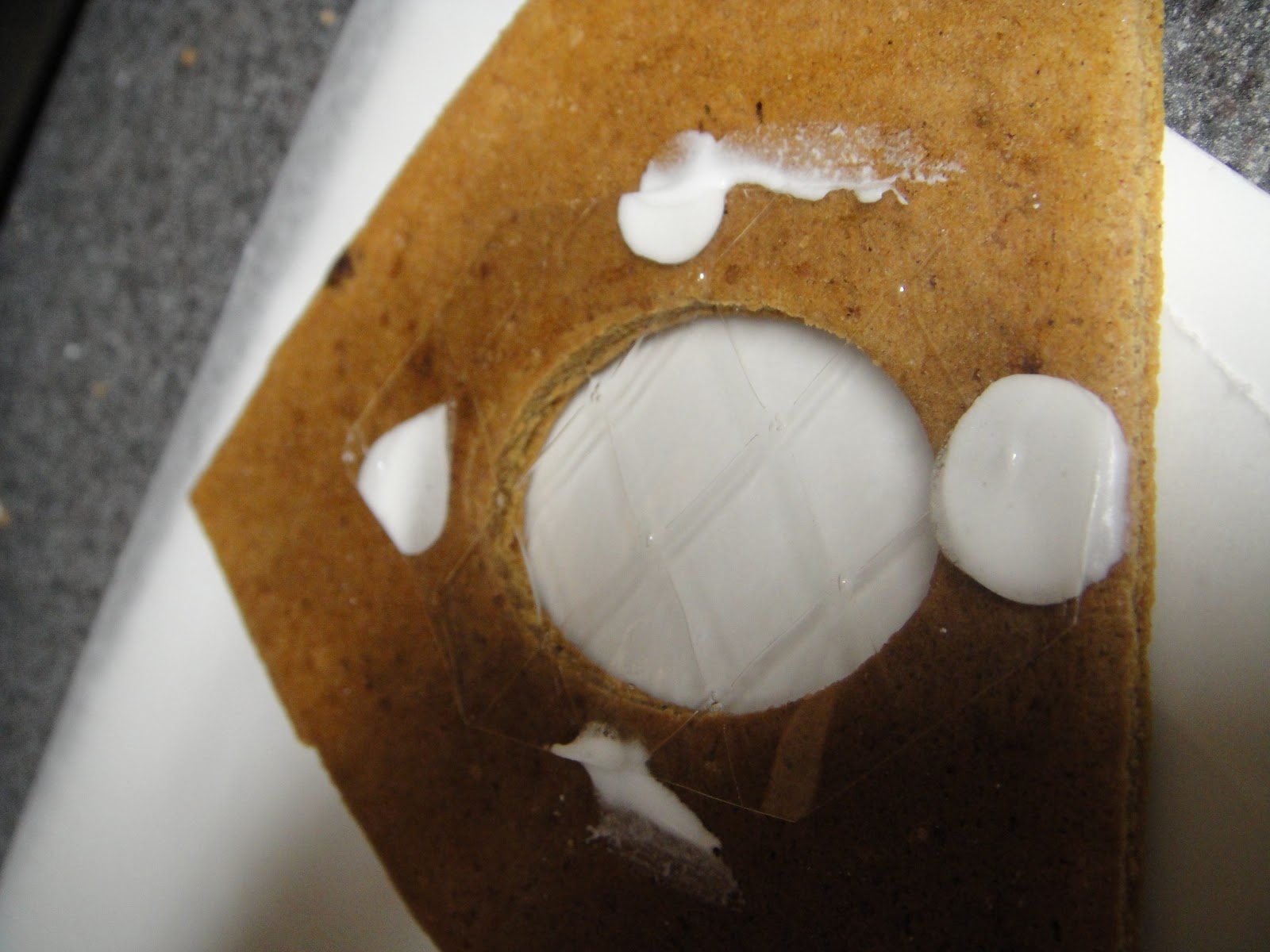 At this point, it is easier to secure your windows. Using embroidery scissors, just cut a square of gelatine sheets and secure with royal icing.